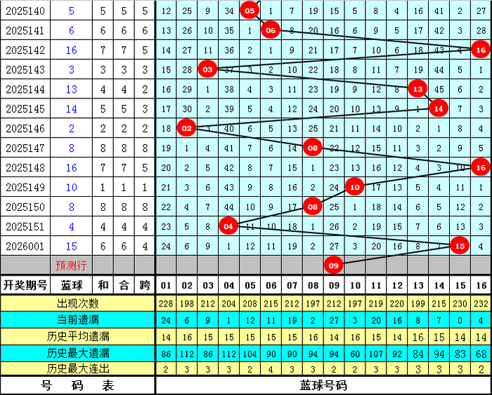 蓝球分析(定义:01-04为一区,05-08为二区,09-12为三区,13-16为四区):上期蓝球开出四区号码15,最近10期蓝球四区落号比为3:2:1:4,总体上三区蓝球较少,四区蓝球表现较热,本期蓝球看好在第三区开出,独蓝参考09。