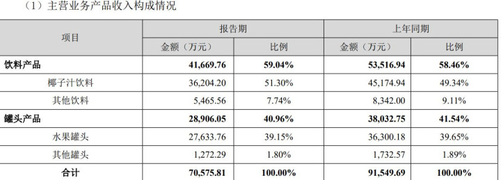 业绩暴跌的背后,是欢乐家核心业务的全面疲软。作为公司第一大收入来源的椰子汁业务,2025年上半年收入同比减少约19.8%至约3.6亿元,而罐头业务收入也同比下降约24.0%至约2.9亿元,两大支柱业务同步失速。