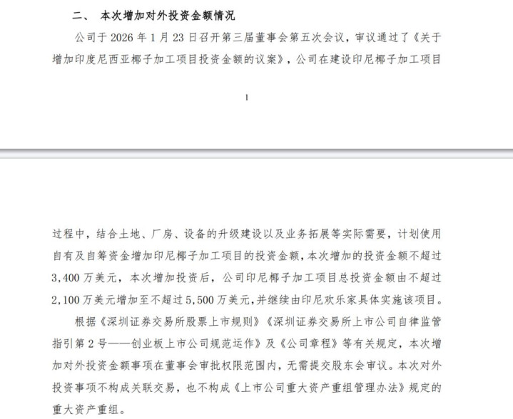 为缓解原料焦虑,欢乐家加码布局上游产业链,2026年1月宣布将印尼椰子加工项目投资额从不超过2100万美元提升至不超过5500万美元,但“远水难解近渴”,该项目短期内难以对于当前成本困境产生帮助。
