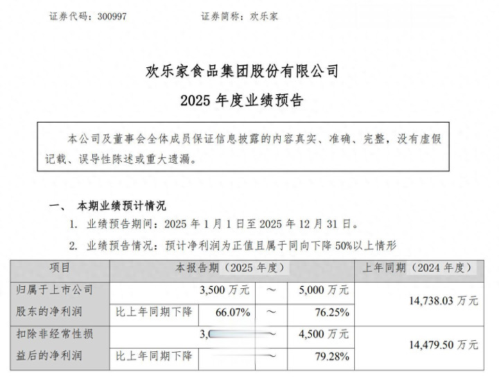 2026年1月23日,曾被誉为“国民糖水代表”的欢乐家披露2025年度业绩预告,预计归属于上市公司股东的净利润(以下简称“净利润”)仅3500万元至5000万元,较上年同期的1.47亿元大幅下滑约66.07%-76.25%;扣除非经常性损益后的净利润更是同比骤降约68.92%-79.28%,交出了上市以来最差的年度业绩答卷。