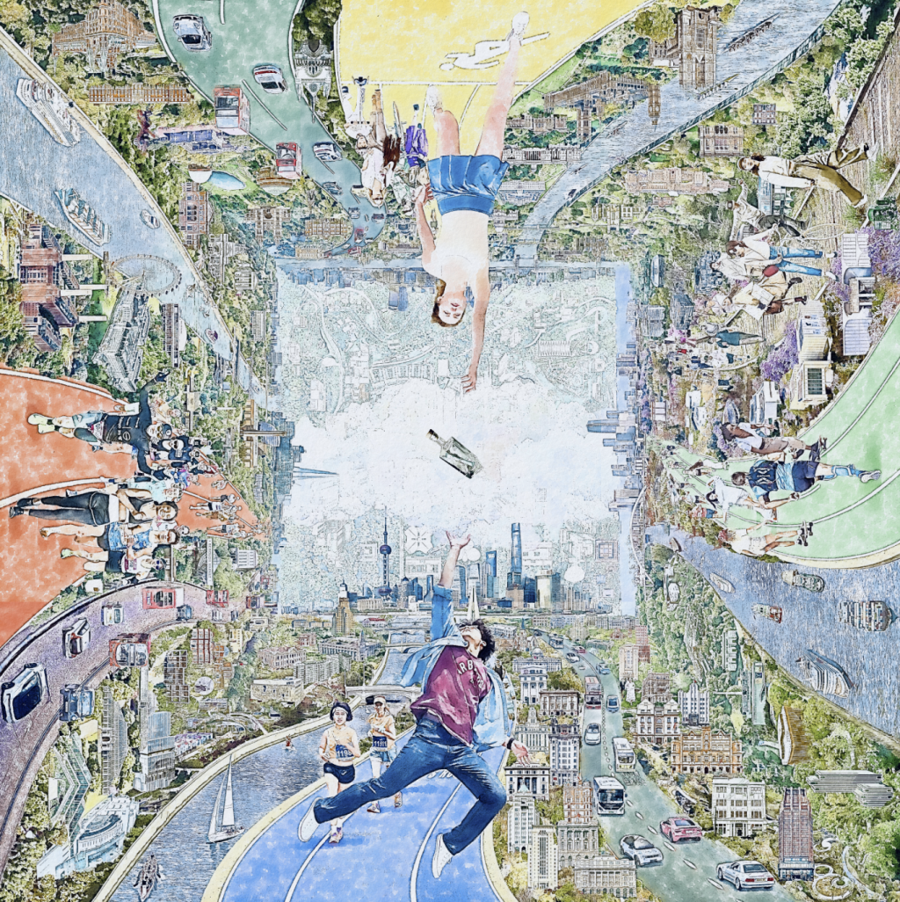 油画采用“超立方体”创新结构,四面铺陈上海外滩、伦敦大本钟等经典地标,中心以交织水流融合双城历史与现实——既呈现外滩万国建筑群、伦敦古典遗产的厚重底蕴,也凸显泰特现代美术馆、龙美术馆等工业遗址的新生活力,在写实传统中注入跨媒介创作思维。