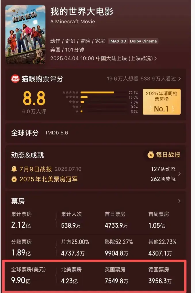 那就是这一部《我的世界大电影》了,是前十名中最德不配位的那一个。