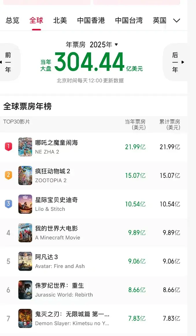 目前,《哪吒2》仍旧是去年影史第一名,总成绩是21.99亿美元,还冲进了影史前五名。